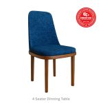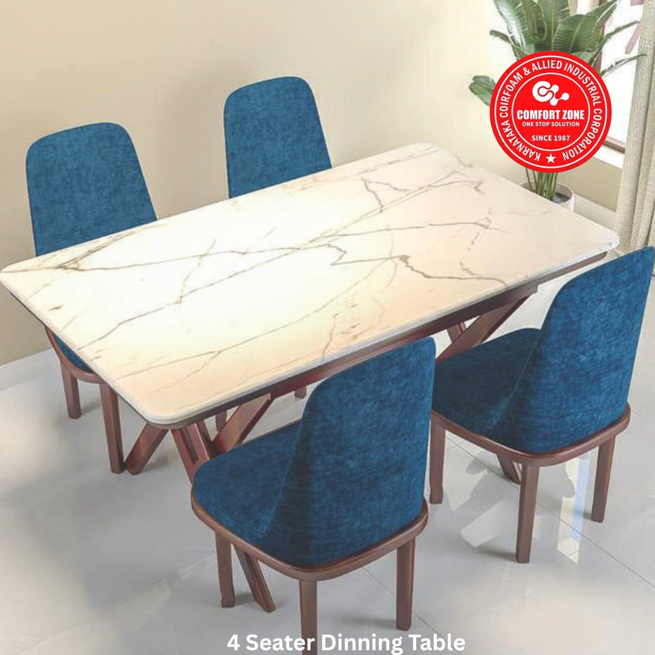 This 4-seater dining table features an elegant marble-finish top paired with a sturdy wooden base. The stylish cushioned chairs in rich blue add comfort and a modern touch to the dining space.
