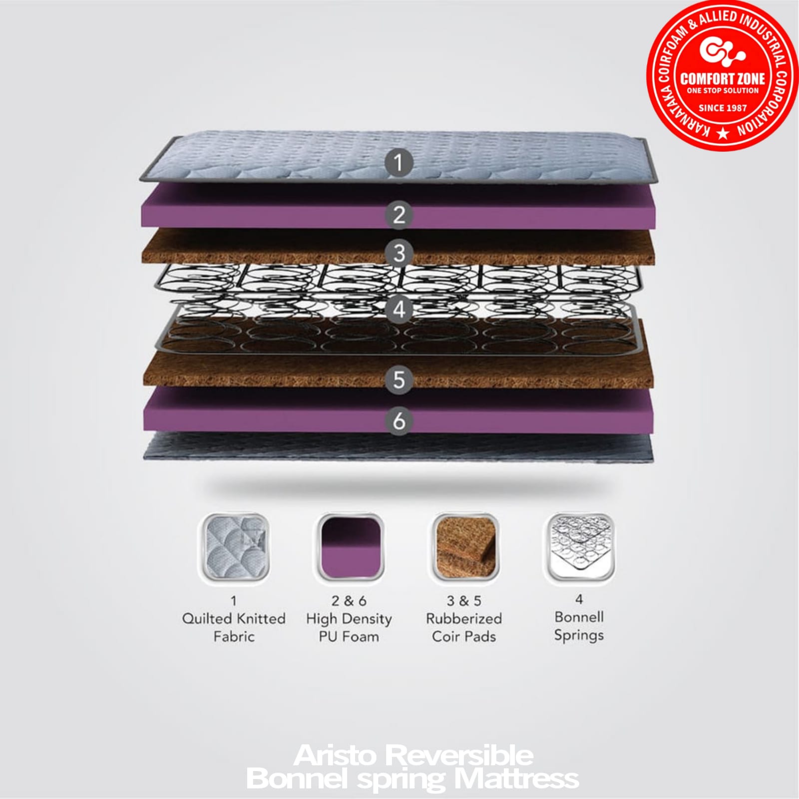 A Classic Bonnell Spring Mattress with High Density Pu Foam on both sides for Reversible usage. Aristo boasts a top-notch spring foundation constructed from unique spring steel wire. It incorporates extra layers of mesh, High-Density Felt, and High-Density Rubberized Coir for added support.