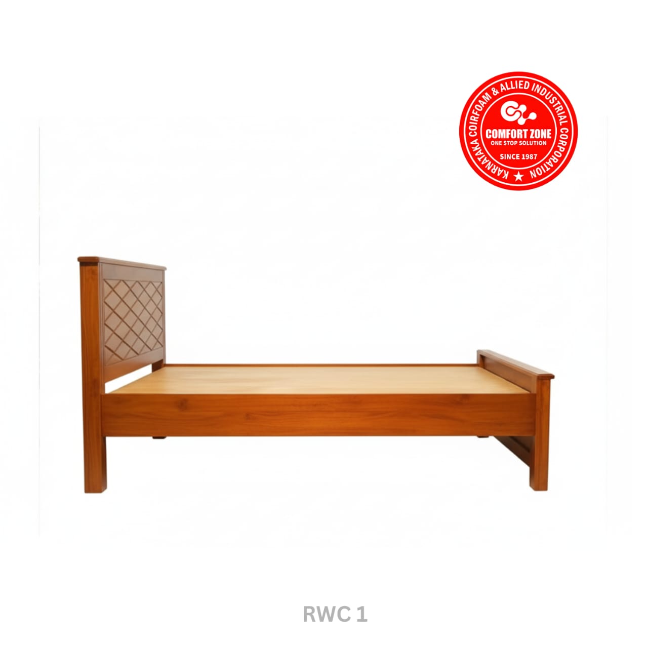 A premium wooden cot with a rich finish and elegant diamond-pattern detailing.