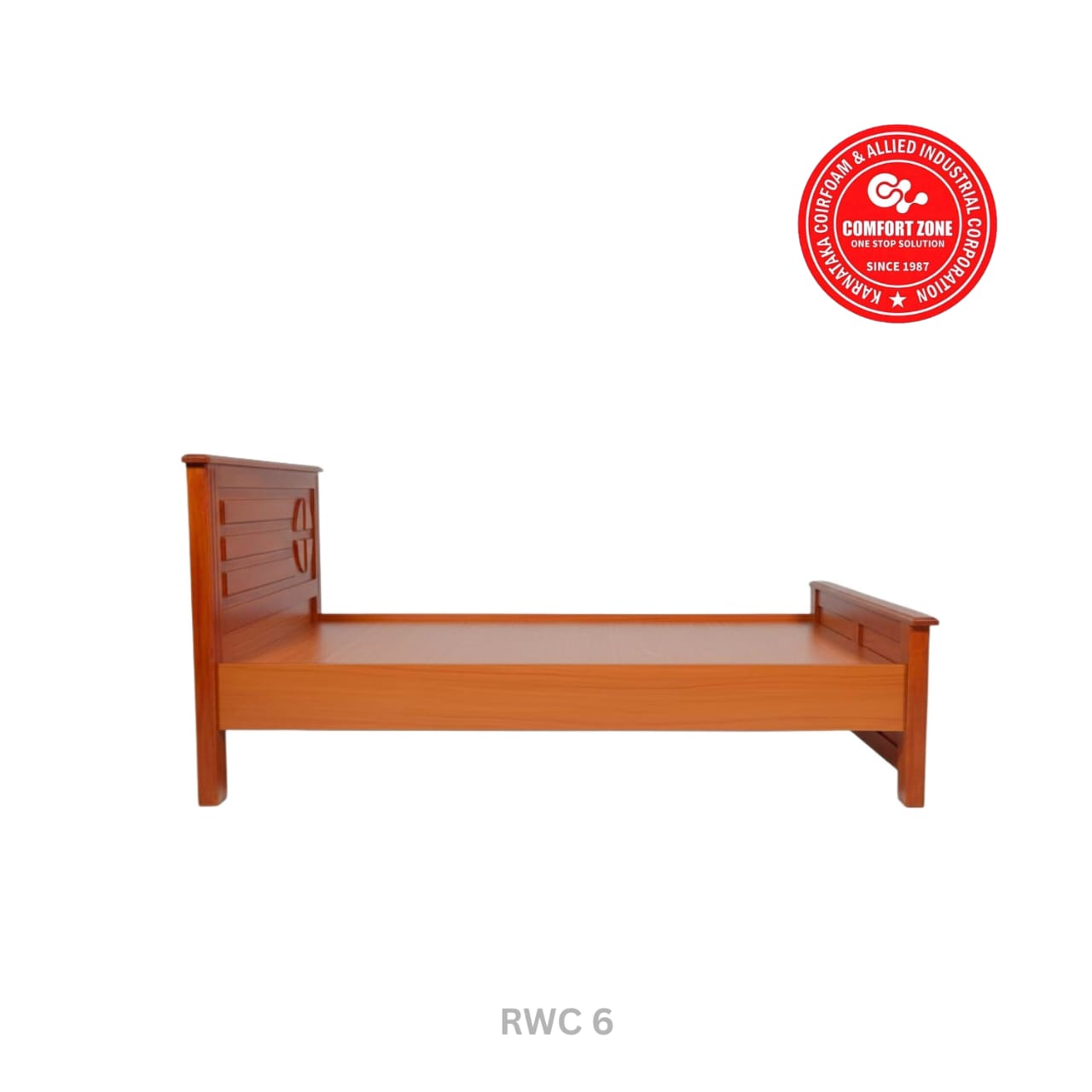 A sturdy wooden cot featuring a sleek linear pattern with unique circular accents.