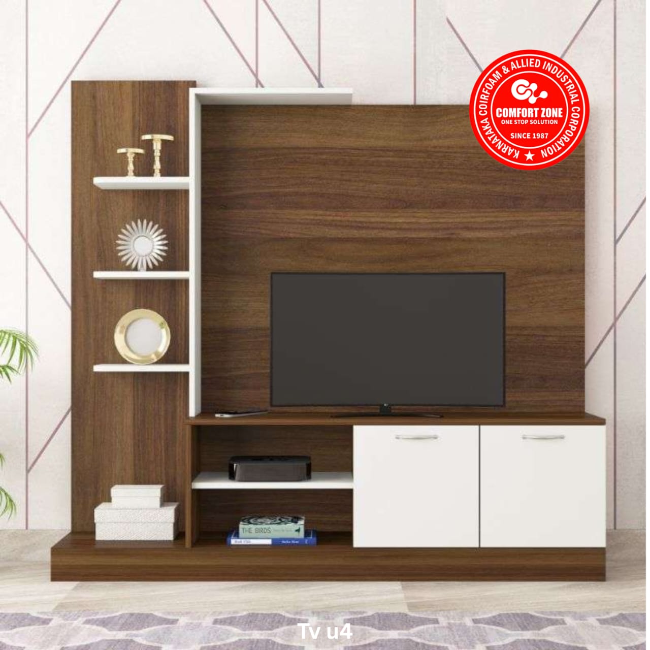 This TV unit features a stylish wood-and-white design with open shelves for décor and spacious cabinets for storage. Its wide panel and sturdy base make it a perfect fit for modern living rooms.