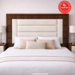 Modern panel-style headboard featuring a plush upholstered center framed with rich wooden detailing.