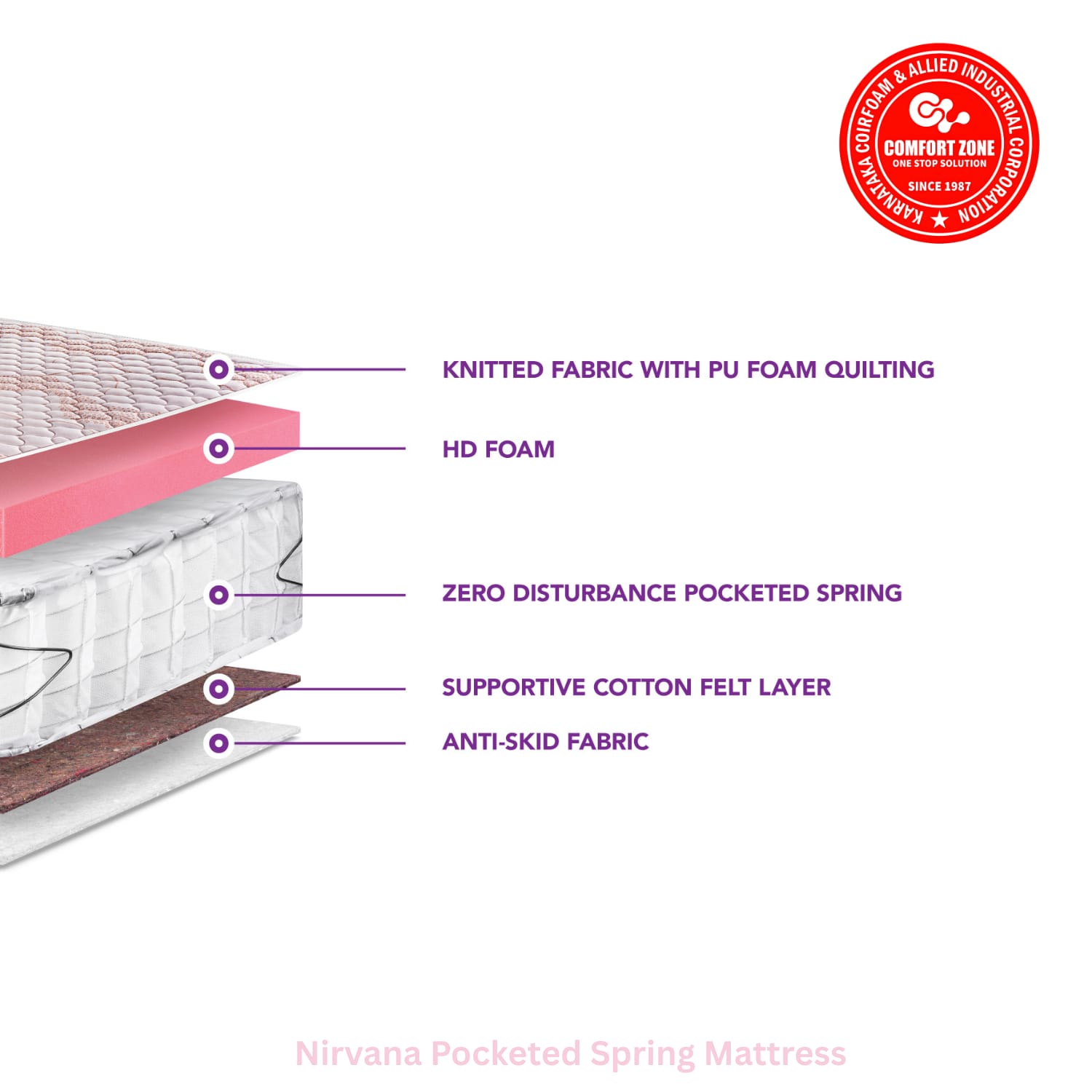 A core of individually pocketed springs creates independent support zones for both sleepers. High density foam adds to comfortable rest undisturbed by your partner’s movements. An edge wire around the spring core further stabilizes the support provided. With a 6-year warranty, 6-inch thickness, and medium firmness, the Nirvana Pro offers enduring quality and restful sleep night after night.