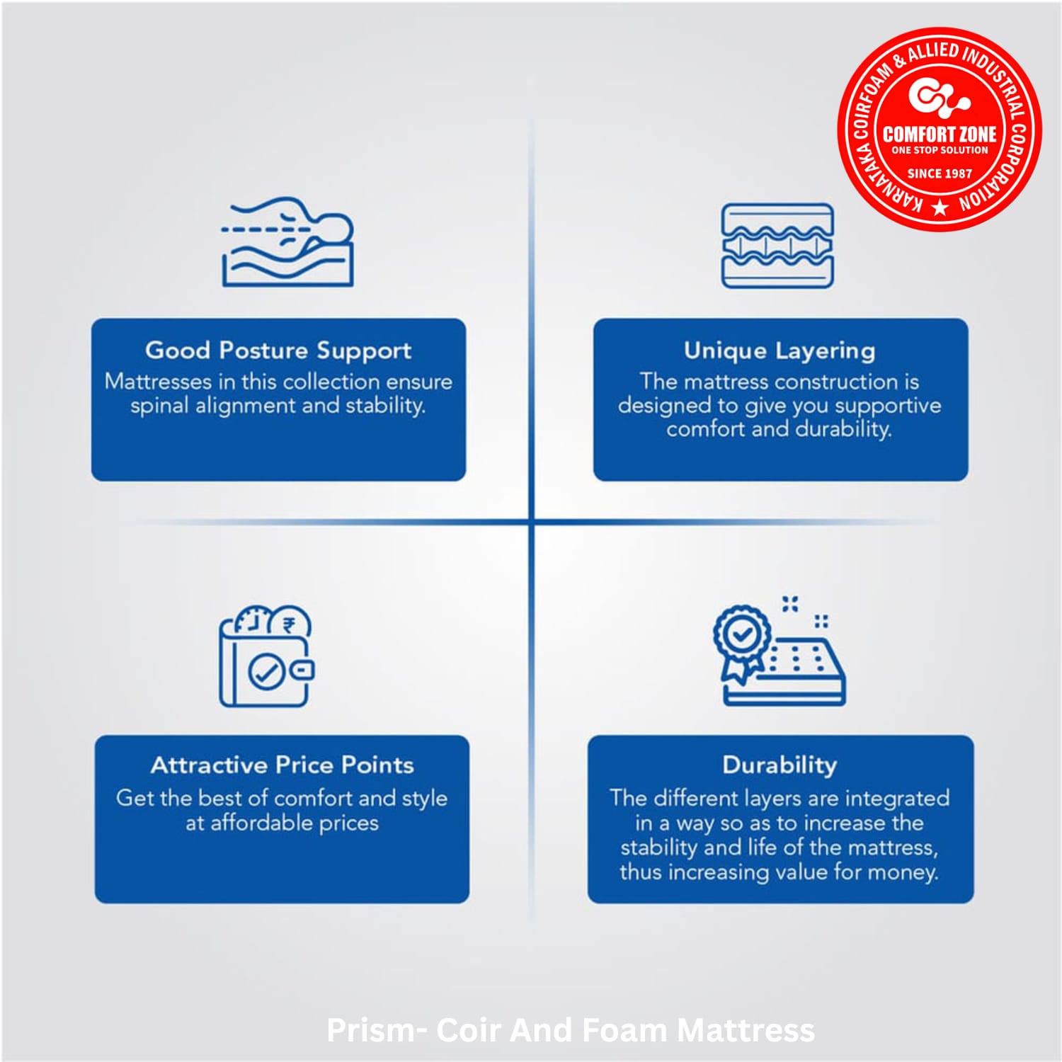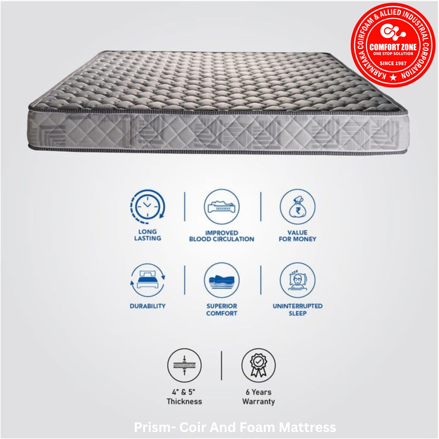 A Uniquely layered Coir Mattress with Rebonded Foam sandwiched between Rubberized Coir Pads and High Density Pu Foam. The highly durable nature of Prism can be attributed to the high density Sandwiched Coir Construction. A topping of premium Pu Foam adds to the comfort and plush feel of this mattress. Thick quilted fabric in attractive design gives it a classy look.