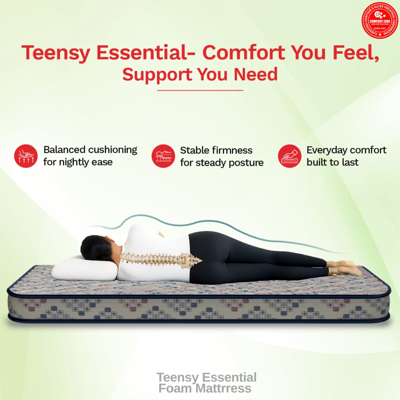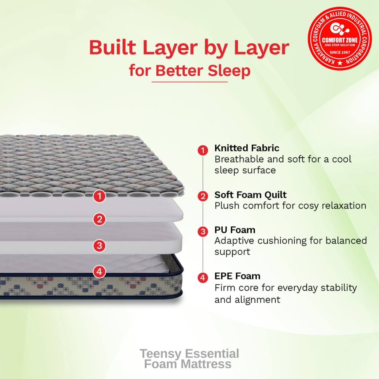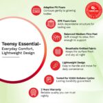 Teensy Essential is crafted for everyday comfort with a balanced blend of cushioning and support. Its PU foam core adapts to growing teens, while EPE foam adds firmness for better alignment. Lightweight and durable, it delivers medium-firm comfort ideal for daily use and restful nights.