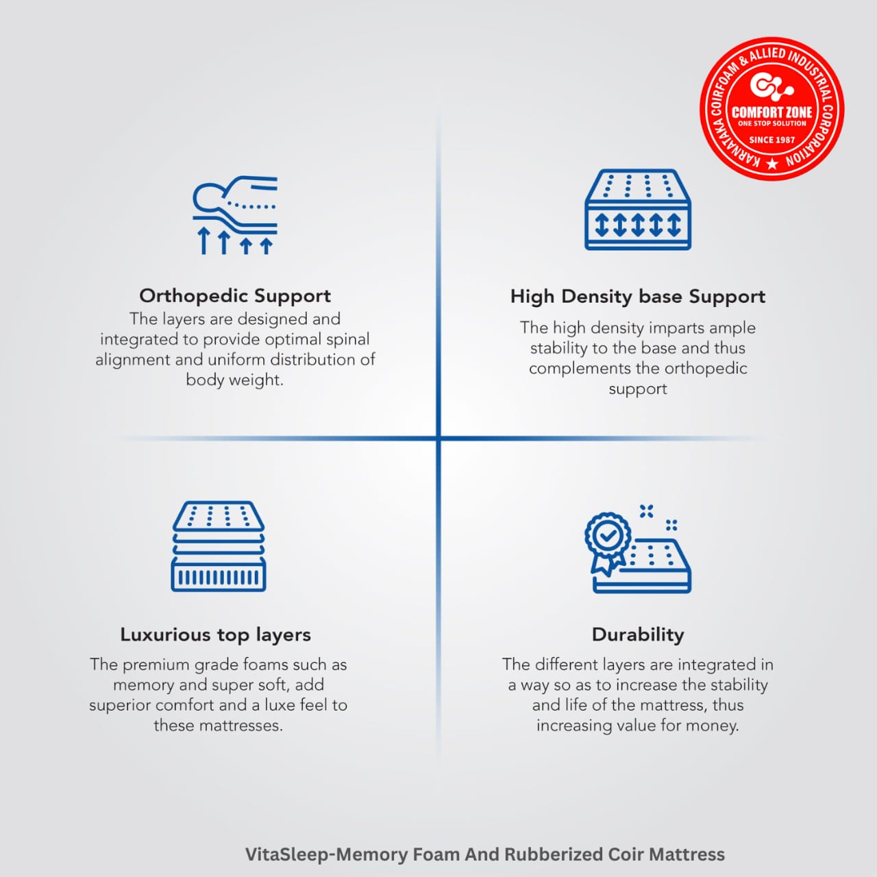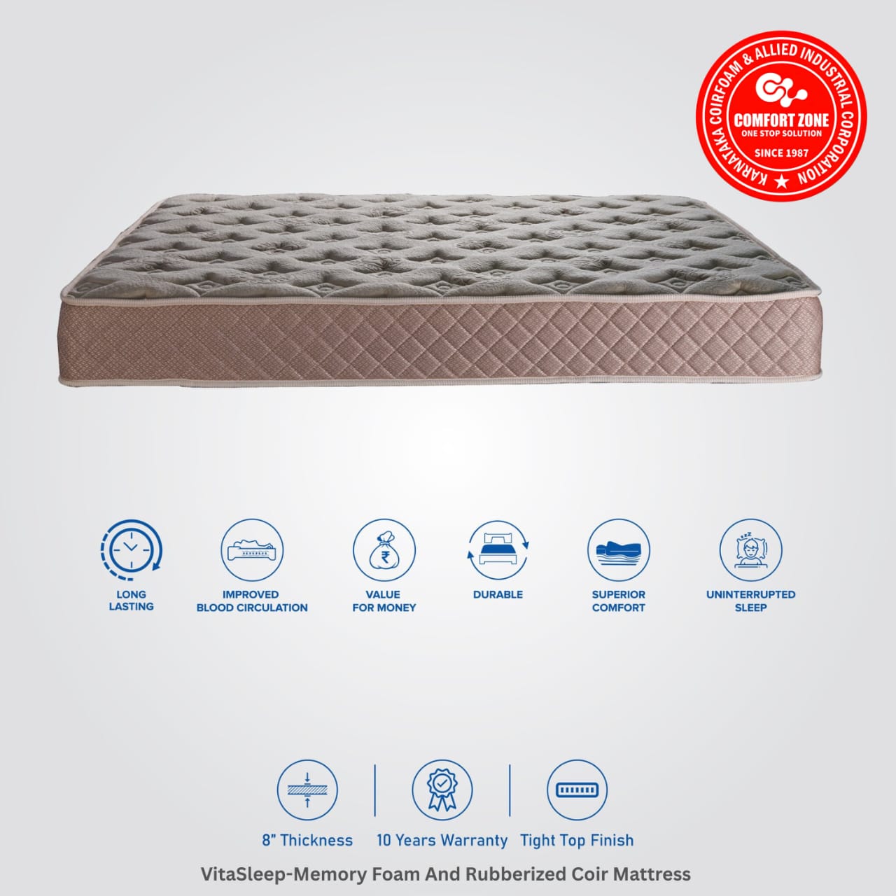 A New Age Technology Mattress with Cool Gel infused Memory Foam and High Density Rubberized Coir, with Bio-Cotton Fabric. Incorporating state-of-the-art Cool Gel-infused Memory Foam, this mattress effectively dissipates heat throughout the night, ensuring a cooler, more comfortable sleep experience.